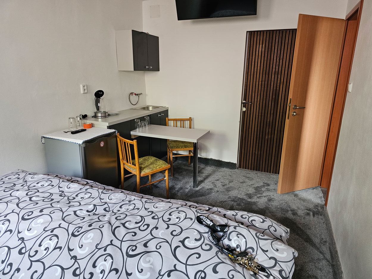 Pokoj číslo deset je nově zrekonstruovaný dvoulůžkový pokoj mini s manželskou postelí, sociálním zařízením a sprchou. Pokoj, který jsme do roku 2024 nenabízeli se nachází v prvním patře a je situován na stranu do parku. Má pokrytí Wi-Fi zdarma. Nabídne Vám soukromí pro chvíle strávené v Rožnově pod Radhoštěm a jeho okolí. Je plně vybaven, včetně varné konvice, ledničky, fénu, s možnosti zapůjčení televize dle Vašeho přání.